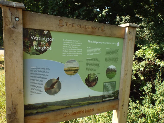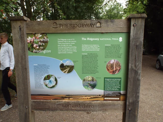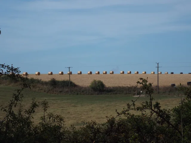 Memory of getting on the train; just! I do remember the nettles and brambles with your brother leading the way to clear a path for the inappropriately dressed one [ed: me]. For me the killer was the last stretch walking over what I remember as a ploughed field followed by the pub not being open but it did have roosting red kites opposite. I think I lost the will to continue but thanks to your encouragement (Just get on and do it!) we did indeed make it. I remember a view of Didcot from the monument overlooking Princes Risborough (memory may be dodgy) after walking up a fairly steep hill. I remember the start at Ivinghoe Beacon where we met a group who had just completed walking the Ridgeway in sections over time and asked if you could take photographs. They had walked from West to East and I remembered them towards the end when we faced into wind and rain. There was a stop in Goring for a pharmacy but I can’t remember the reason: blisters? The stack of hay bales is where we managed to get some shade from the sun whilst discussing organ workshops.