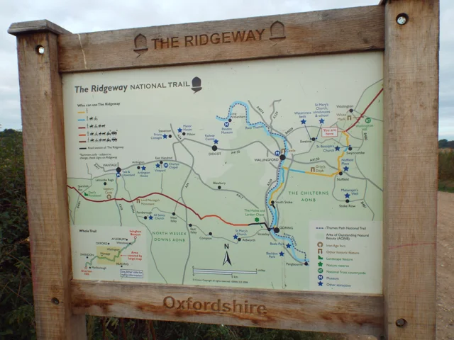 Memory of getting on the train; just! I do remember the nettles and brambles with your brother leading the way to clear a path for the inappropriately dressed one [ed: me]. For me the killer was the last stretch walking over what I remember as a ploughed field followed by the pub not being open but it did have roosting red kites opposite. I think I lost the will to continue but thanks to your encouragement (Just get on and do it!) we did indeed make it. I remember a view of Didcot from the monument overlooking Princes Risborough (memory may be dodgy) after walking up a fairly steep hill. I remember the start at Ivinghoe Beacon where we met a group who had just completed walking the Ridgeway in sections over time and asked if you could take photographs. They had walked from West to East and I remembered them towards the end when we faced into wind and rain. There was a stop in Goring for a pharmacy but I can’t remember the reason: blisters? The stack of hay bales is where we managed to get some shade from the sun whilst discussing organ workshops.